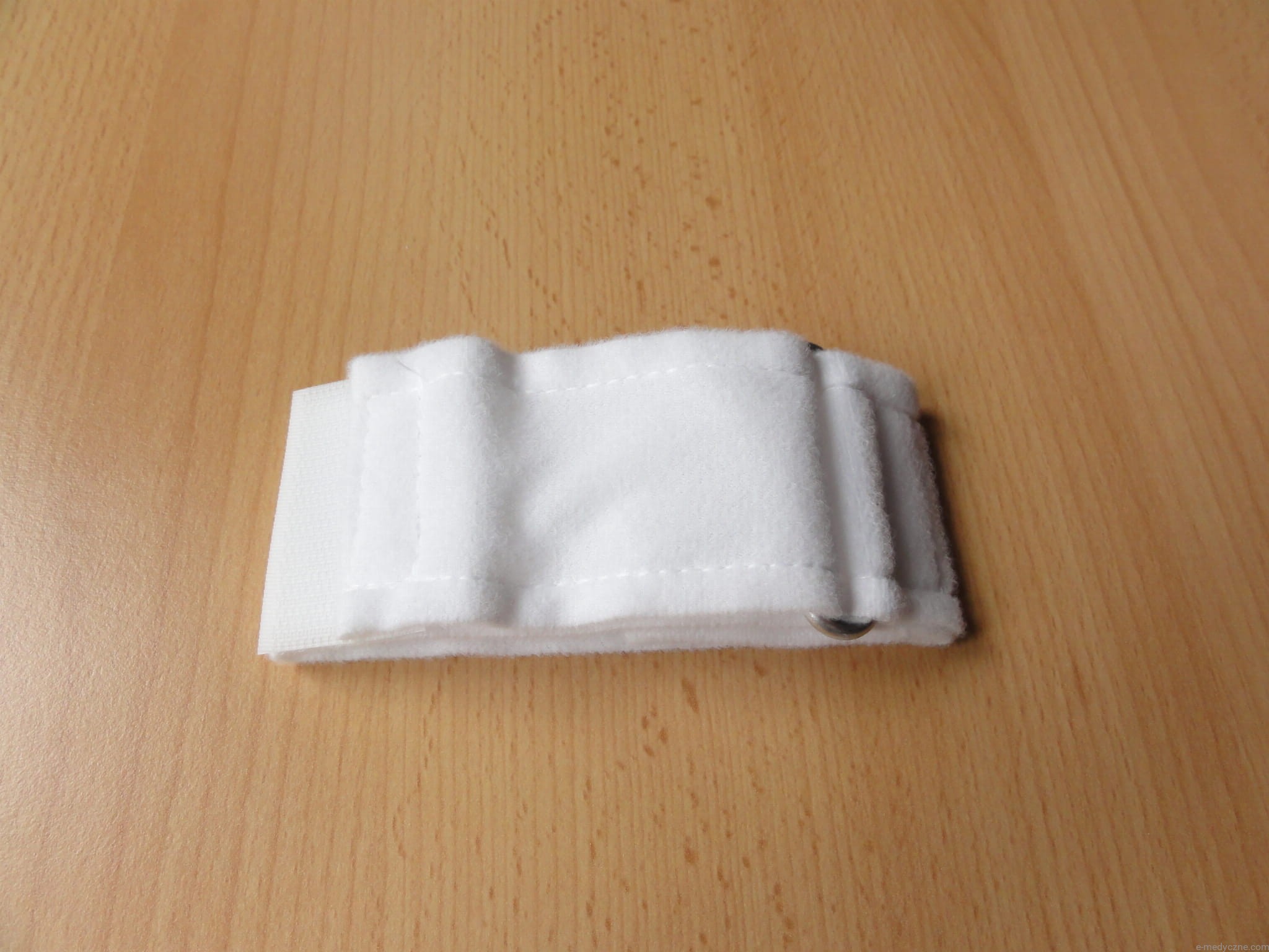 Opaska na łokieć tenisisty prosta. Produkuje się w jednym rozmiarze, w kolorze białym lub granatowym.