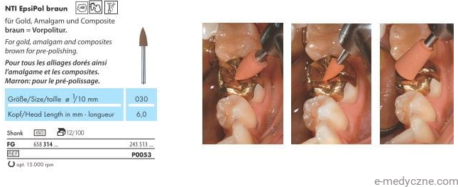 Gumki do polerowania na turbinę NTI EpsiPol dostępne są w dwóch wersjach: brązowej P0053 i P0055 do wstępnego polerowania i zielonej P0153 - P0155 do polerowania na wysoki połysk. Mogą być stosowane do wszystkich stopów metali szlachetnych, w tym złota oraz amalgamatu i kompozytów.