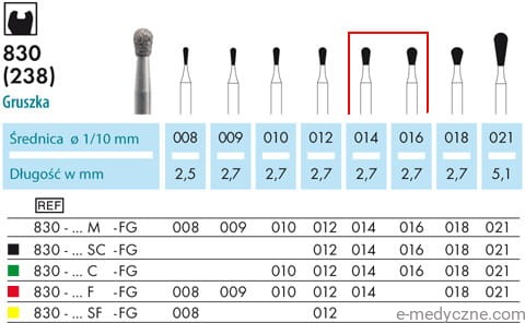 Dentystyczne wiertła diamentowe - gruszki 830 na turbinę produkcji niemieckiej firmy NTI-Kahla GmbH. W cenie tutaj podanej w średnicy 010. W uziarnieniu średnim M.